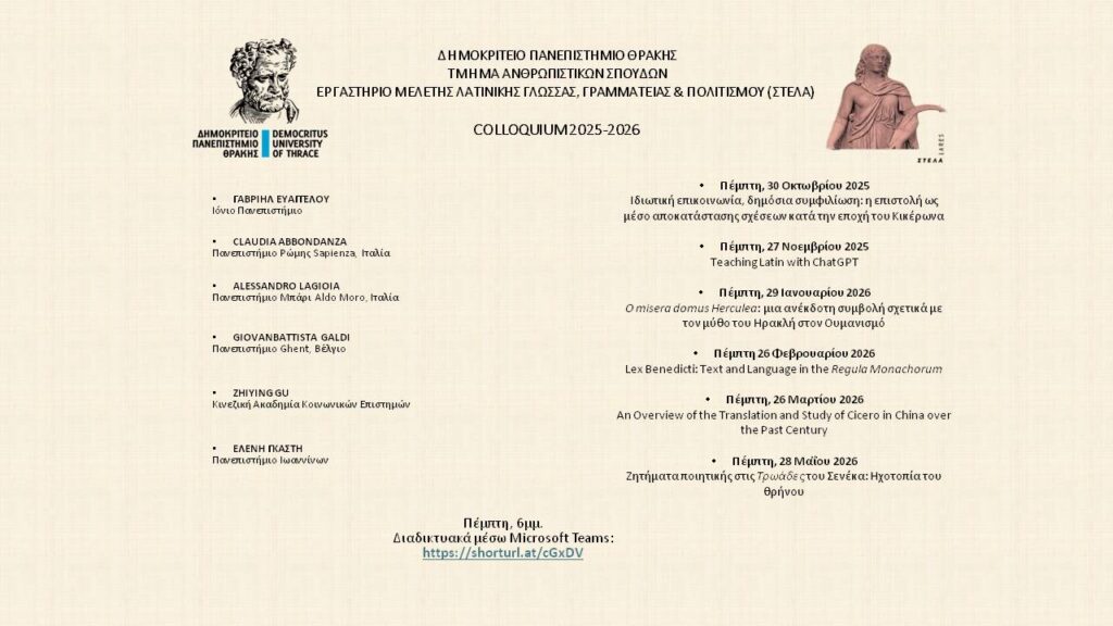 Το Εργαστήριο Μελέτης Λατινικής Γλώσσας, Γραμματείας & Πολιτισμού διοργανώνει Colloquium για το ακαδημαϊκό έτος 2025–2026.